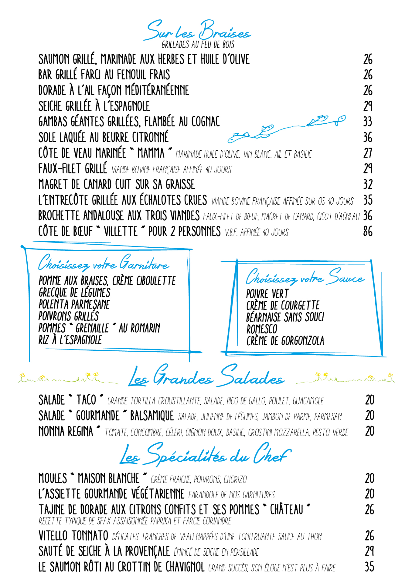 Carte restaurant 2024 - Plats, Salades, Spécialités - Maison Blanche